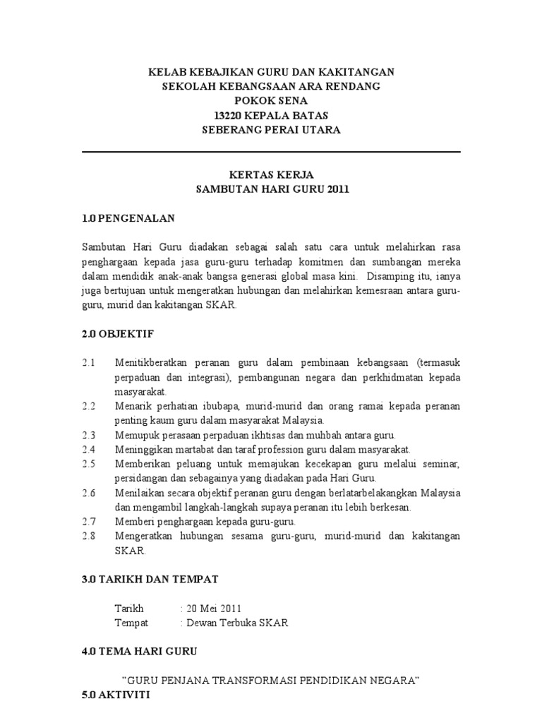 Di samping itu Sambutan Hari Guru ini juga adalah sebagai medium untuk mengeratkan hubungan antara semua guru. Sila klik link biru di sebelah Kertas Kerja Sambutan Hari Guru Peringkat Sekolah 2016 untuk kertas kerja tahun 2016. Contoh Kertas Cadangan Program - Contoh Kertas Cadangan Program Pembangunan Staff Syarikat.